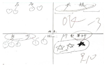 那么一年级的创新作业则是采用不同形式去完成常规作业,方式(1)采取画画的方式去理解位置关系,数字代表什么、多和少、长和短、同样多、多多少、少多少、几和第几,更直观去感受生活中的数学现象,方式(2)录制视频记录每一次的常规作业,比如录制与家长一起玩数学游戏的视频,拍怕游戏,家长叫口令,孩子做动作,打乱顺序,良好的位置体验,再例如采用手势舞的方式录制分与合的背诵视频,活泼生动、又好记,再如录制数数作业视频,了解孩子是否可以有规律、有顺序地数数,是否会指读数数。通过这样不同形式去完成作业,一年级的孩子乐在其中。
