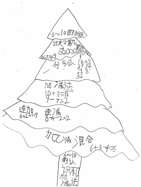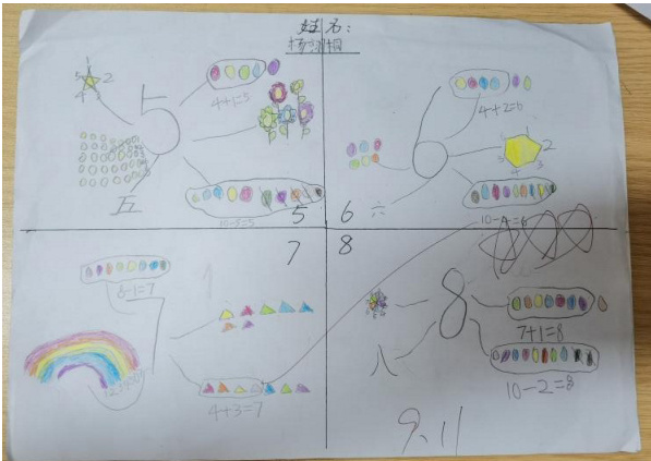 同样地,在我今年执教的一年级的探索性作业,预习作业居多,找一找家里的立体图形并进行介绍,在这个过程中可以让孩子自己去感受实际生活的数学模型,或者动手制作立体图形,深刻感受每个图形的特点,从中体验更多数学知识;复习作业中也可以出现,动手制作算式卡片,与家长用卡片进行口算游戏,游戏和口算结合更巧妙,也可以布置制作思维导图的作业,系统梳理单元的知识点;综合性地,整合立体图形单元、游戏单元以及数字单元课,布置体验卡的作业,用家里的玩具或者积木或者小棒,摆一摆,数一数,感受生活中的排队问题,理清前后左右上下的位置关系,几和第几的数量关系,让孩子用数学眼光去观察世界,亲自动手去探索生活中的数学奥秘,并用画画方式记录这些过程,也将美术融入到了数学中,每一个孩子的画都有浓浓的数学味道,奇妙无比。