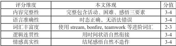 1. 审题要点:紧扣" 户外活动"(露营)包含三要素:过程(搭帐篷、篝火)、困难(下雨)、感受(团队合作的重要性)