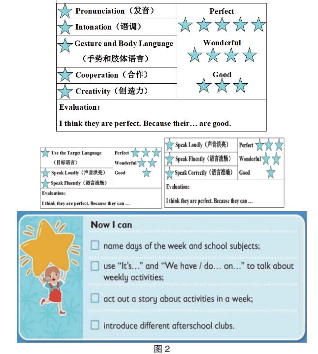 为了深入挖掘单元主题意义,教师需要采用多种评价方式,包括对学生语言知识、语言技能以及情感态度等多方面情况的考查,通过这些方式可以更全面地掌握学生对单元主题相关内容的掌握程度。教师可以采用师评、生评、小组评、自评等多种方式,也可以利用在线评价来活化评价主体,提升学生的参与意识。例如在三年级下册Unit 6 A great week 单元教学评价时(如图2),可利用生生互评考查学生对一周七天单词的拼写以及文本教材的掌握;可利用小组比拼让学生用英语描述自己一周内每天的活动,以此考查其表达的流畅性与准确性;同时观察学生在课堂小组活动中参与讨论一周活动安排时的积极性和合作态度,评价其情感态度。通过多种评价方式相结合,教师可以全面了解学生对“一周的天数及日常活动”这一主题的掌握情况,还能加深学生对该主题的理解。