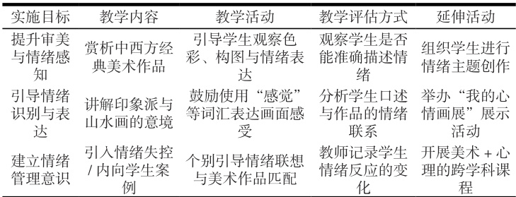 美术作品作为情感与审美的重要媒介,在促进幼儿情绪感知和审美能力发展方面具有显著作用。通过引导学生观察如莫奈的《日出·印象》《睡莲》及梵高的《星夜》等名画,学生能借助色彩和构图感知画面情绪,并尝试用“颜色”“感觉”“天气”“人物心情”等词汇表达自己的内在情感。例如,一位情绪易失控的学生在欣赏《星夜》时形容画面像“头脑中的争吵”,帮助教师理解其情绪状态。另一位心神不宁的学生在赏析《溪山行旅图》《江南春》后逐渐平静,并表示画面带来安静的感受。美术赏析不仅提升了学生的艺术素养,更激活了其对情绪的识别与表达,有助于建立良好的情绪管理能力。基于上述研究整理相关可实施方案见下表。