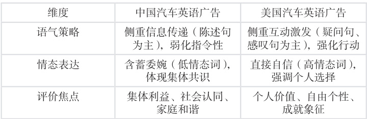 美国汽车英语广告偏爱使用疑问句来增强与受众的互动性。例如,“Doyou want a car that combines power and comfort?”这样的疑问句能够激发受众的思考,让受众更加主动地参与到广告的沟通中。美国汽车英语广告中高情态词如“must”“will” 的使用较为常见,传递出直接自信的态度,凸显个人选择权。例如,“You must have this car to enjoy the ultimate driving pleasure.”这种表达体现了广告商对产品的自信,同时也让受众感受到自己拥有选择的权利,能够满足个人的需求和欲望。