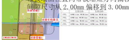 某架次机身对接,中后机身下壁板组件、左侧壁板组件和右侧壁板组件调姿完成后,定位内侧的 5 条对接带板,发现带板之间间隙、带板与长桁接头连接的紧固件边距超差最大3mm,如图2 所示带板端面位置向带板缩短方向偏移 0.43mm
