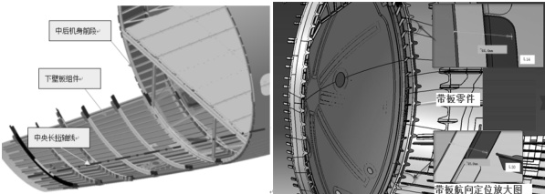 下部壁板周向以壁板中央长桁轴线为定位基准,兼顾其他长桁轴线位置,前后各贴中后机身前段框和球面压力框上的带板,航向靠蒙皮对缝间隙保证,如图3 所示。