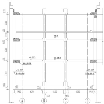 某地下车站为双柱三跨三层岛式车站,设计总长度为 149m ,标准段宽21.9m,端头井宽度 26m。小里程端头井下三层净空高度为 7.76m,端头井侧墙采用分层浇筑,第一次浇筑面标高为 -10.865m ;设备层板顶标高为 -6.865m,剩余 3.6m 侧墙和设备层板(板厚为 400mm. )同批浇筑,小里程端头井剖面如图1 所示。