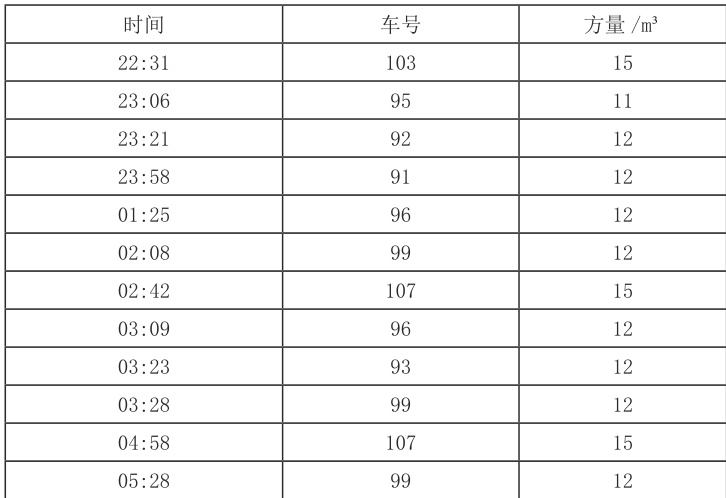 项经部施工员于 23 日下午 1 时接到混凝土搅拌站电话通知,由于外加剂使用错误:发往施工现场的混凝土掺入了强效缓凝剂,混凝土初凝时间大于36h 以上,要求现场暂缓拆模。24 日项经部施工员在监理见证下,尝试拆除侧墙封头板,发现侧墙混凝土超 36h 后仍未凝固。由搅拌站实验室了解到,该批超缓凝外加剂主要成分为葡萄糖 + 白糖,进货时装入 2 号生产线 3 号罐,于 22日晚 21:08 分 2 号生产线普通外加剂 4 号罐用空后操作直接转换为 3 号罐外加剂使用,替换了原车站混凝土配合比中的 TW-JSA 高效减水剂,因此造成现场混凝土超缓凝。由搅拌站施工记录和现场浇筑记录追溯,发现掺入超缓凝外加剂的混凝土发往施工现场的共5 车总计 60m3 。混凝土供应记录如表1 所示。