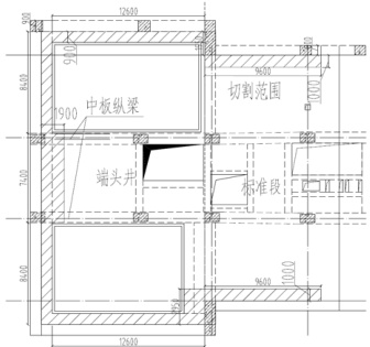 小里程端头井结构段范围内,端头井侧墙厚度为 0.9m ,标准段侧墙厚度为0.8m,设备层板厚度为 0.4m ,端头井侧墙上部环梁厚度为 0.7m (环梁伸出侧墙 0.9m⋅ )。端头井切割厚度为 0.7m ,总长 54.3m,其中 7.4m 切割宽度为 1.9m(包含纵梁截面 900mm×1000mm. ),45.9m 切割宽度为 0.9m ;标准段切割厚度为0.4m,总长 19.2m ,切割宽度为 1m,钢筋混凝土重度取 2.5t/m3 ,设备层梁板切割范围如图3 所示。