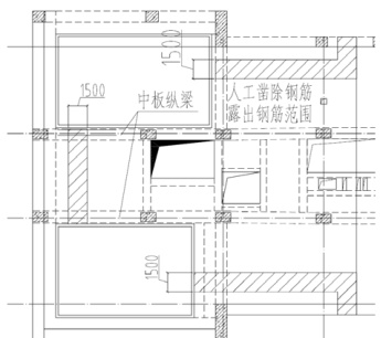 为后期浇筑混凝土时,使新浇筑混凝土与设备层板保留部分形成整体,保证设备层板强度,在保留的设备层板上,采用风镐人工凿出设备层梁板钢筋,宽度约 1.5m,凿除混凝土过程中注意对现有结构梁板钢筋进行保护[1]。人工凿出设备层板保留钢筋范围平面图如图5 所示。