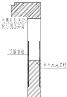 凿除至原施工缝后利用风镐剔除浮动石子,检查凿除后混凝土表面是否密实,有无明显空隙,如有空隙也应凿除,并用水冲洗干净,为了更好的加强新旧混凝土面粘结,在新旧混凝土接触面处涂刷一层水泥基结晶防水涂料[2]。侧墙混凝土清理示意图如图6 所示。