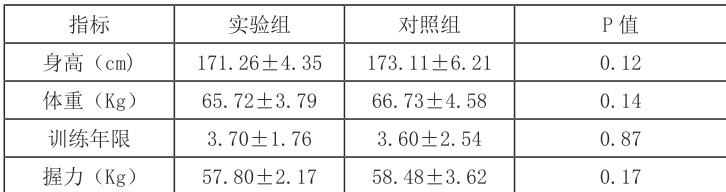 注:根据攀岩运动项目特点选取:握力、引体向上、悬垂举腿作为标准来比较通过指标数据分析显示:对照组与实验组之间比较 P >0.05,无显著性差异,两者可以进行比较。