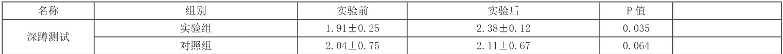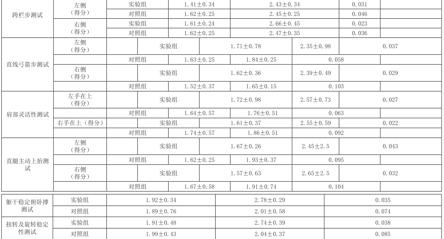 通过上表可以看出:实验组全面显著提升: 所有测试项目(深蹲、跨栏步、直线弓箭步、肩部灵活性、直腿主动上抬、躯干稳定俯卧撑、扭转稳定性),其训练后成绩均呈现统计学显著改善(所有P 值 < 0.05,范围0.022-0.043)。对照组改善有限或不显著: 对照组在各项测试中虽有轻微提升,但均未达到统计学显著水平(所有P 值 > 0.05,范围0.058-0.104)。实验组在训练后的提升幅度普遍显著大于对照组,尤其在涉及动态平衡、核心控制与不对称发力的项目(如跨栏步、直线弓箭步、肩部灵活性)上优势更为突出。