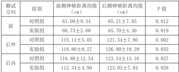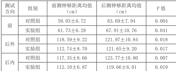 由以上3 表可以得出以下两点结果:1、伸够距离的差异化提升;实验组:后向伸距进步更显著,右腿支撑时,左脚后外方向提升8.91cm,左腿支撑时,右脚后内方向提升10.69cm,
