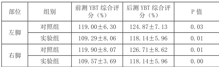 后向伸距增幅普遍高于对照组5-7cm。对照组:前向伸距改善占优但幅度有限;右腿支撑前伸:对照组提升4.66cm,实验组提升 6.18cm,说明稳定训练对矢状面 衡有基础作用,但非稳定训练在多维动态平衡中综合表现更优。2、YBT 综合评分:实验组神经肌肉控制提升更全面;实验组综合评分提升幅度显著高于对照组30%以上(左脚40.6%,右脚25.8%),体现神经肌肉控制能力的全面优化。