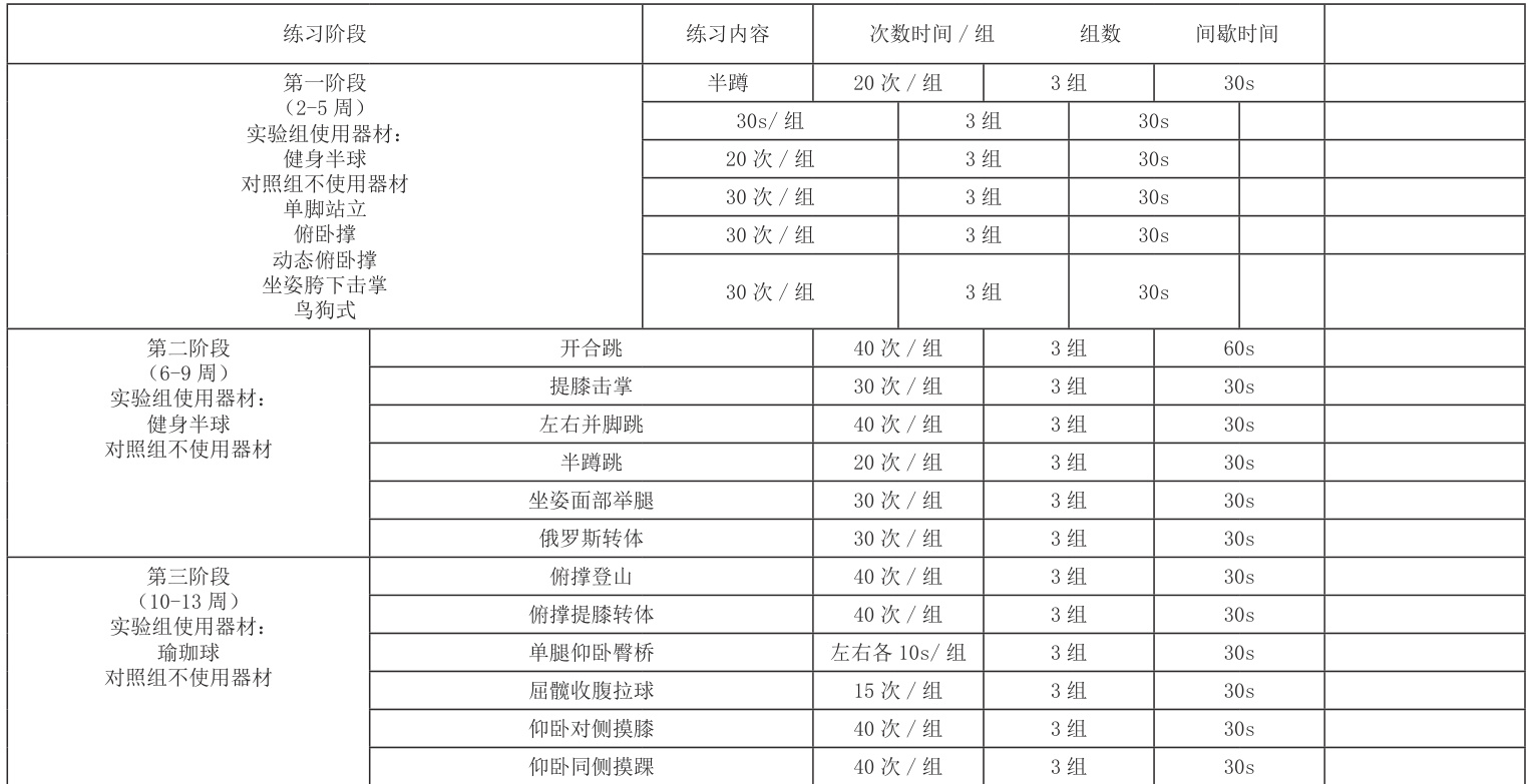 本次训练动作内容设计方案参考Mark Verstgen 撰写的《核心区训练》[2]、国家队体能教练王轩所编译的《核心训练指南》[3] 以及王卫星、 韩春 ] 等人的研究而提出 训练过程遵守力量训练的部分基本原则(如超负荷原则、练习顺序原 肌肉均衡性等设计训练动作。 为确保两组在训练和测试中保持一致性,两组队员除了正常参加专项技 加为期12 周(第1 周为 验,第14 周进行测试),每周3 次,每次 1 小时的核心力量训练,对照 核心力量训练,实验组则借助器械进行非稳定性核心力量训练。在非训练期间不做与实验有关的练习动作,每次训练和测试均由本人和教练组织。