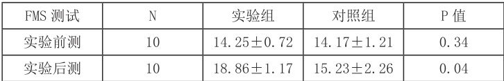 由上表得出:通过训练,实验组、对照组 FMS 成绩均有增长,实验组增长率优于对照组。统计学显示:实验前两组数据并无显著性差异 (P>0.05) ;实验后,具有显著性差异 (P⟨0.05) 。