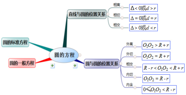 通过思维导图的使用,我们可以了解圆的方程所包含的四个主要的知识点,分别是圆的标准方程,圆的一般方程,直线与圆的位置关系,两圆的位置关系。对于直线与圆的位置关系,根据判定方式,又可以分为相离、相交和相切等。对于圆与圆的位置关系可以根据圆心距和半径的关系分为外离、外切、相交、内切和内含。通过思维导图建立的框架,让学生对圆的方程有一个清晰的认识,有助于学生对知识点的记忆。