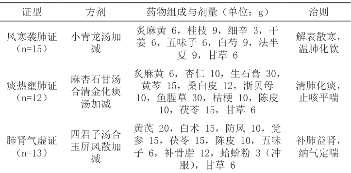 次,2 次 /d); ② 解痉平喘:氨茶碱片口服( (0.1g/ 次,3 次 /d); ③ 化痰:盐酸氨溴索口服( 30mg/ 次,3 次/d)。疗程4 周。中医组患者在西医常规治疗基础上联合中医辨证分型治疗,具体如表 1 所示。每日1 剂,水煎分2 次服,疗程4 周。
