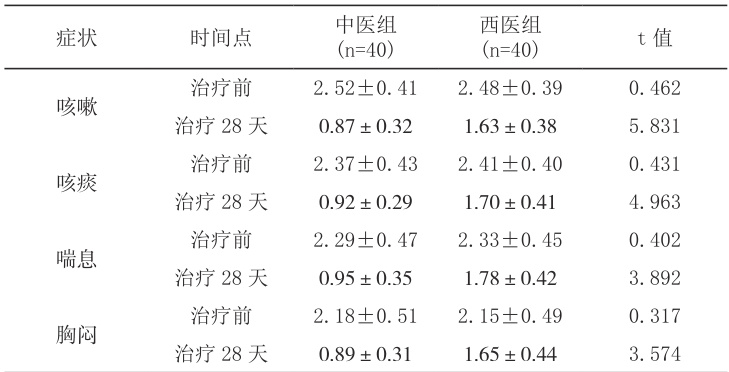 (1)在治疗前、治疗 28 天,对两组患者的咳嗽、咳痰、喘息、胸闷等主要症状的严重程度进行分级量化,分别是无症状、轻度症状、中度症状、重度症状,对应 0 分(症状完全消失)、1 分(偶尔发作,每日不超过 5 次,不影响生活)、2 分(频繁发作,每日 6~10 次,轻微影响日常活动)、3 分(持续发作,每日超过10 次,明显影响睡眠和日常行为)。