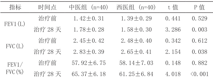 (2)在治疗前、治疗 28 天,检测并比对两组患者的肺功能指标,主要是FEV1(第 1 秒用力呼气容积,单位:L)、FVC(用力肺活量,单位:L)、FEV1/FVC(%)——核心气流受限指标。