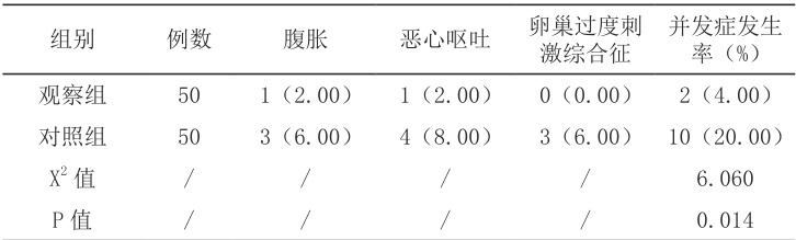 观察组实施集束化护理。即:1、全面术前宣教:术前详细评估患者的基础健康状况识别高危人群。同时,向患者及家属开展健康宣教,提高患者对并发症的认知与重视,增强其自我管理意识,缓解术前焦虑情绪。2、术中精细化监测与护理:手术过程中,密切监测患者的生命体征,及时发现异常并处理。根据患者情况合理调整麻醉剂量与方式,避免因麻醉因素增加术后并发症风险。同时,与手术医生保持密切配合,严格遵循操作规范,减少手术创伤,降低术后不良反应发生几率。3、术后针对性症状管理:术后加强对患者症状的观察。对于轻度不适,指导患者采取舒适体位,通过腹部按摩、听音乐等方式缓解;对于症状较明显者,遵医嘱给予相应药物治疗,并记录症状变化。此外,鼓励患者早期下床活动,促进胃肠蠕动,预防腹胀及血栓形成。4、个性化饮食与液体管理:根据患者个体情况制定饮食计划,鼓励摄入高蛋白、高维生素、易消化的食物,以补充蛋白质,减轻腹水形成。同时,指导患者合理饮水,遵循“少量多次”原则,避免一次性大量饮水增加胃肠道负担。5、持续心理支持与随访:取卵术后患者因身体不适及对妊娠结果的担忧,易产生焦虑、抑郁等不良情绪。护理人员需主动与患者沟通,倾听其诉求,给予心理疏导与安慰,增强患者治疗信心。建立术后随访机制,通过电话、微信等方式定期了解患者恢复情况,及时解答疑问,指导后续治疗与护理,提高患者依从性与满意度。