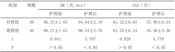 (1)分别对比两组护理前后心率(HR)变化和焦虑情绪(SAS)变化。(2)统计术后并发症。