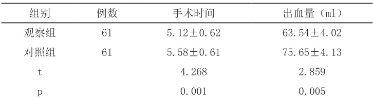 观察组的患者手术时间、出血量等指标明显优于对照组( .P<0.05. ),见表1