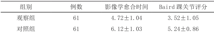 观察组患者手术后影像学愈合时间、Baird 踝关节评分明显优于对照组(P<0.05 ),见表2。