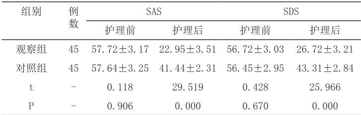 2.1 对比两组患者护理前后的心理状态护理后,观察组SAS 和SDS 评分均较对照组更低( (P<0.05) ),见表1。