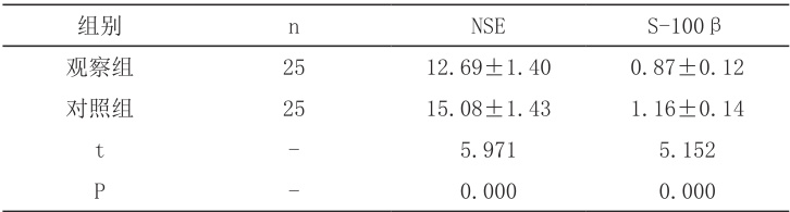 见表2 :观察组NSE、S-100β 水平更低 (P<0.05) )。