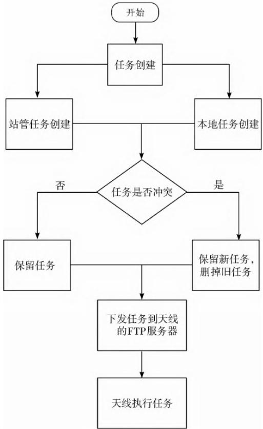 作为软件系统的核心功能模块,任务计划管理模块主要涵盖以下两项核心功能:第一,具备基于预设双行根数生成跟踪任务计划的能力,同时可通过站管协议接口实现外部任务指令的标准化接收;第二,能够执行任务计划冲突检测分析并编制子站级任务计划表,最终实现跟踪任务计划的闭环管理。具体来讲创建流程(如图1)所示。