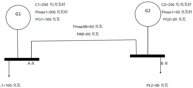 图 A, 图 B 点的机组负荷分别为 100MW 和 80MW,总负荷为 180MW,A,B 间的最大传输容量为 60MWc 。根据出清机制,线路发生阻塞,A,B 节点的出清价分别为 250 元 / 兆瓦时和 350元/ 兆瓦时,此时G1、G2 的出力分别为160MW 和20MW,用户侧平均结算价为294.4 元/ 兆瓦时。