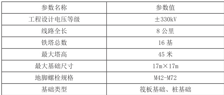 本文所述高精度控制技术应用于嘉峪关 500MW/1000MWh 独立储能电站配套 330kV 升压站工程送出线路中。该工程线路全长6 公里,途经山地、丘陵、平原等多种地形,跨越铁路、高速、国道以及 110kV 线路 5 条,共设铁塔 16 基,其中耐张塔 11 基,直线塔 5 基。工程所在区域地质条件复杂,跨越施工难度高等特点,对铁塔基础施工提出了较高要求。项目主要技术参数如下表所示: