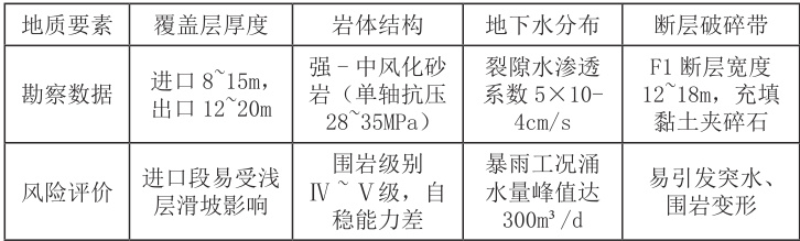 通过对该隧道进行勘察,得出以下结果: ① 围岩稳定性:该隧道有 65% Ⅳ级围岩,有 20% Ⅴ级围岩。所以,在施工时,应利用“管棚 + 注浆”的方式,积极做好超前支护工作。 ② 边坡稳定性:该隧道天然工况安全系数为 1.25,暴雨工况系数为 0.98。所以,施工过程中,应积极做好“锚索 + 格构梁加固”的工作。 ③ 施工风险:孤石区,盾构掘进会存在较大的摩擦阻力,因此,要优先选用高强度合金刀具。 ④ 突水风险:该隧道的断层带突水概率加高,故此,要切实做好“径向注浆 + 环向排水盲管”的工作,以实现对突水风险的有效应对。