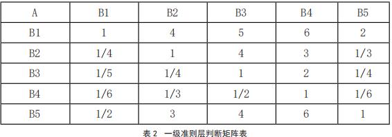 一级准则层进行两两比较,构建判断矩阵 A,见表2。