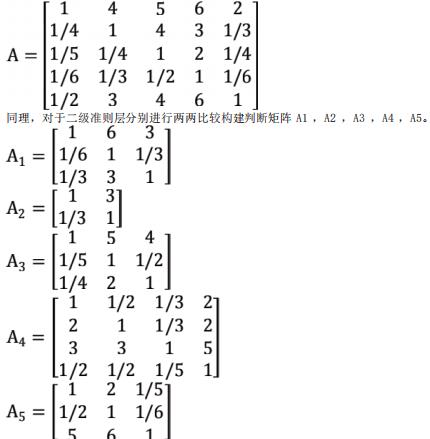 同理,对于二级准则层分别进行两两比较构建判断矩阵 A1 ,A2 ,A3 ,A4 ,A5。