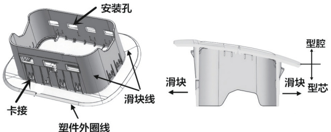 在此部分的设计中,主要涉及滑块和斜推的抽芯设计。安全气囊塑件的左右均存在固定卡扣的底座,且以斜导柱和滑块抽芯机构,因为塑件右侧是下斜滑块,最大的倒扣距离22.5 mm,则滑块的抽芯距离为22.5+(2\~5)mm ;塑件左侧最大的倒扣距离23.5 mm,则滑块的抽芯距离为23.5+(2\~5)mm。