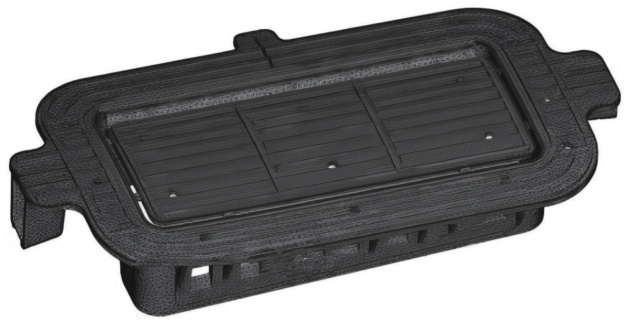 本研究所用汽车安全气囊框架选用 PC/ABS 材料,此材料同时具备 PC 材料和 ABS 材料的性能优点[6]。设置有防错的结构,此安全气囊的 王架 其结构尺寸为315×185× 95mm,重量为 357g,主壁厚 3.5mm,且整体的壁厚具有良好均匀度, 在气 囊框架 两侧位置存在不同挂钩孔的数量,防止安全气囊出现装反情况,同时为了使塑件在卡口位置不会出现磨损或者压缩的现象,还设置有减胶槽。