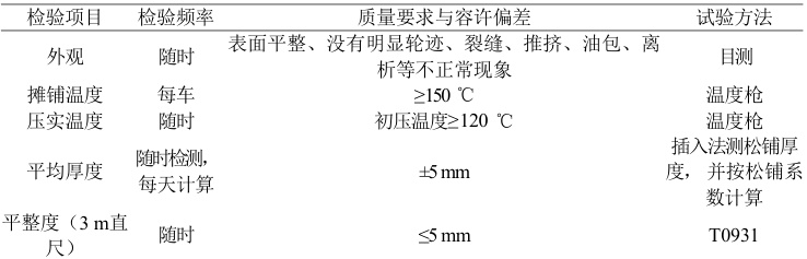 表1 展示了混合料在摊铺和碾压过程中的质量检查频次和标准