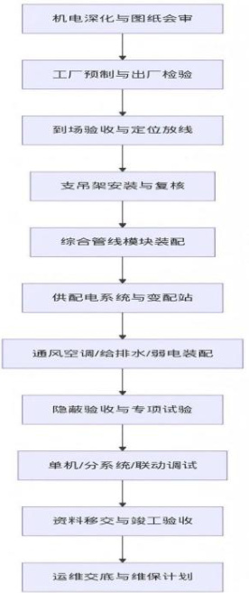 调试与交付阶段以功能安全为主线展开。先进行隐蔽工程与单体分系统检查,包括绝缘与接地测试、管道强度与严密性试验、风量与水力平衡等,再组织单机试运、分系统与多系统联动调试,验证电气选择性、暖通通风效果与自控逻辑。质量管理贯穿首件确认、过程巡检与分阶段验收,资料同步生成与移交,包含竣工图、试验记录与设备台账。为确保运营期可靠性,完成运维培训、备品备件配置与维保计划发布,并建立偏差纠错与接口协调机制,支撑工程在安全、进度与成本维度的综合最优(机电安装的基本流程见图1)。
