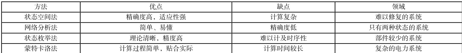 目前最常采取的可靠性评价方式包括状态空间法、网络分析法、状态枚举法和蒙特卡洛模拟法等[13],他们各自优缺点不同,不同方式对照如表1 所示。其中网络分析法是先将串并联结构的不同元件进行等效合并得到简化后的系统网络图;状态空间法根据马尔可夫过程求解各状态间的转移概率和稳态概率进而推导出系统的可靠性参数;状态枚举法按照失效准则,将系统状态分正常运行、故障两类,针对故障状态的影响程度来确定故障状态的数量,得到故障状态所占的概率来表示系统的可靠性;而蒙特卡洛法通过使用随机抽样方法生成大量系统状态样本,通过对大量样本进行统计分析以得到系统可靠性。