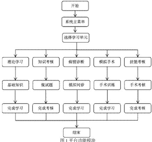 低位单纯性肛瘘手术仿真实训平台依托中医理论与触觉技术,构建沉浸式 VR 实训环境,实现肛瘘诊疗全流程模拟。从系统功能设计出发,构建3D 模型、病情问诊、手术操作及考核体系的实现路径,通过搭建“理论知识-实践操作-考核评估”一体化架构,为中医外科虚拟实训提供创新解决方案。平台具体功能模块构成如图1所示。