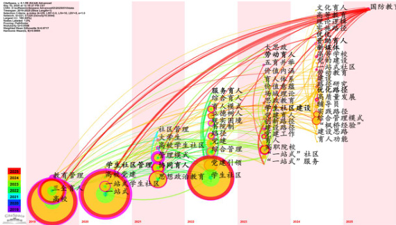 时区图展示了高校一站式学生社区研究在不同年份的发展情况。从图中可以看出,2019 至2020 年期间,研究主要集中在高校、教育管理、三全育人等基础概念上,这些概念构成了后续研究的基础。随着时间推进,2021至2022 年,一站式学生社区、高校党建、学生社区等关键词逐渐凸显,标志着研究开始聚焦于一站式学生社区的具体模式和党建引领作用。到了 2023 至 2025 年,国防教育、文化育人、高质量发展等新兴主题不断涌现,表明研究内容在不断拓展和深化,从基础模式探索向多元功能和高质量发展方向转变。