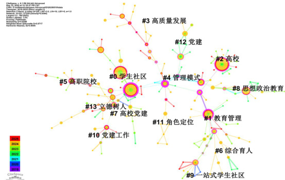 聚类图将相关研究主题进行了分类整合。图中可以看到多个聚类标签,如#0 学生社区、#1 教育管理、#2高校、#3 高质量发展、#4 管理模式、#7 高校党建等。这些聚类涵盖了高校一站式学生社区研究的不同方面。例如,#0 学生社区聚类包含了学生社区建设、社区管理等内容,是研究的核心范畴;#7 高校党建聚类则聚焦于党建工作在学生社区中的开展,包括党建育人、党建引领等方面。不同聚类之间存在相互关联,如高校党建与学生社区管理、思想政治教育等聚类相互交叉,表明高校一站式学生社区研究是一个多维度、跨领域的综合性研究。