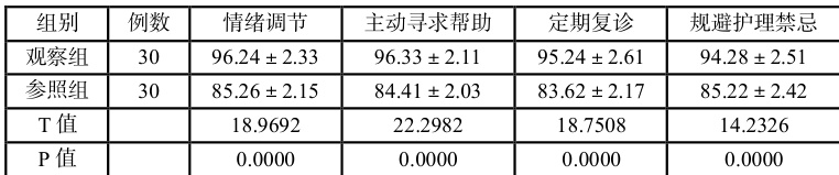 观察组患者的心理压力评分低于参照组, p<0.05 ,见表 1 者的遵医嘱行为评分高于参照组, p<0.05 ,见表 2 。