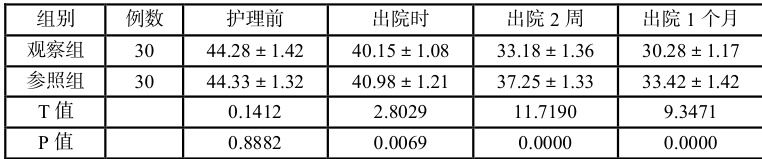 (1)心理压力对比:分别针对两组患者护理前、出院时、出院 2 周、出院 1 个月的心理压力指数进行分数的评估,若分值范围在 0~5 分代表患者的心理状态处于正常;若分值范围在 6~10 分代表患者的存在轻度的压力;若分值范围在 11~20 分代表患者存在中度的压力;若分值范围在 21~31 分代表患者存在重度压力。