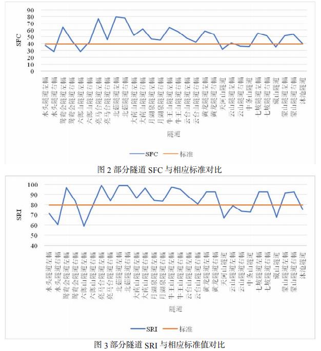 (1)从SFC 指标对17 座隧道进行评价,其中水头隧道、六郎山隧道右幅、天河山隧道、云山隧道右幅、中条山隧道以及藏山隧道的SFC 检测值低于40,不满足规范要求。