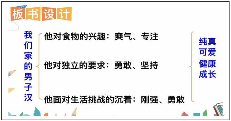 四下第六单元《我们家的男子汉》一课的教学中,结合文章导读中要求的“结合课文中的小标题,说说为什么称这个孩子为男子汉”将板书做了如下图的设计,清晰地呈现文章各个部分展现的“男子汉”的特征,对学生理解课文,“把握长文章的主要内容”有很大的帮助,亦可以说有一目了然之效果。