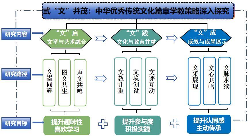 弎“文”并茂:中华优秀传统文化篇章学教策略深入探究:是指在中华优秀传统文化篇目学习时,探索文学与艺术的融合;实施深耕文化教育;融合成效展示优化学教方式,落实“启智与增慧”“积累与运用”“思维与创新”“融通与传承”的育人目标。