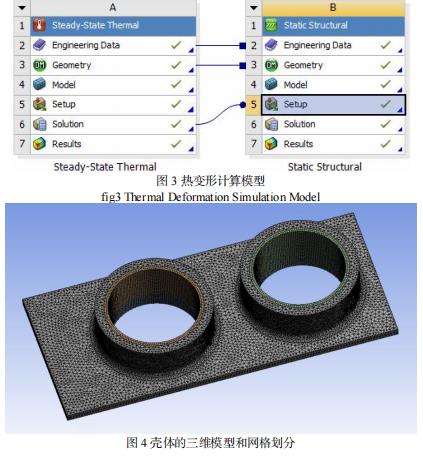在数值分析软件中建立稳态热分析模块和静态结构分析模块,并将这两个模块相互耦合,共享几何模型,把热分析的计算结果作为结构分析的输入条件,如图3 所示。