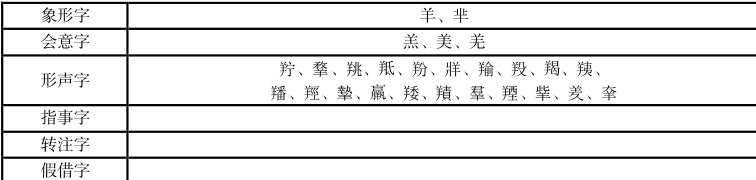 六书是古人分析汉字归纳出来的六种构造方法。许慎在《说文解字·叙》中对“六书”进行了系统的阐释:一曰指事。指事者,视而可识,察而见意,上下是也。二曰象形。象形者,画成其物,随体诘诎,日月是也。三曰形声。形声者,以事为名,取譬相成,江河是也。四曰会意。会意者,比类合谊,以见指撝,武信是也。五曰转注。转注者,建类一首,同意相受,考老是也。六曰假借。假借者,本无其字,依声托事,令长是也。羊部作为一个重要的部首,在《说文解字》中一共含 26 个字,依据许慎的六书理论,下面对羊部字进行系统分类,汇成《羊部》字六书分类表。
